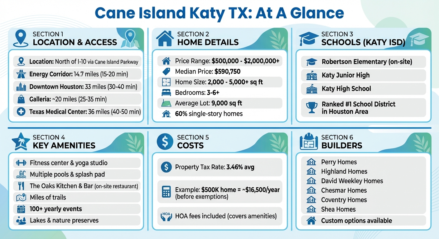 Cane Island in Katy, TX, is a high-end master-planned community offering spacious homes, resort-style amenities, and top-rated schools in Katy ISD. Located just off I-10, it provides easy access to major job hubs like the Energy Corridor and Downtown Houston. With features like an on-site restaurant, scenic trails, and year-round events, Cane Island balances luxury with a welcoming neighborhood feel. Homes range from $500,000 to over $2 million, with options for both production and custom builds. While property taxes and HOA fees are higher than average, the lifestyle and location make it a standout choice for families and professionals alike.