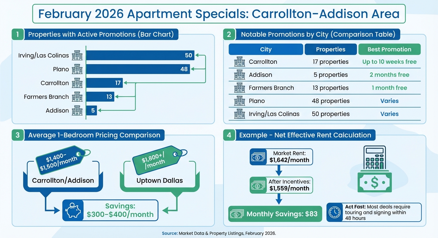 Carrollton, Farmers Branch & Addison Apartment Deals Comparison February 2026