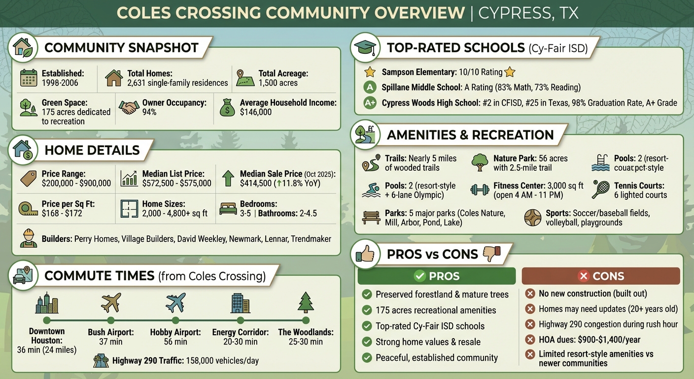 Coles Crossing in Cypress, TX is a well-established, nature-focused community with 2,631 single-family homes, offering a peaceful lifestyle with mature trees, green spaces, and top-rated schools. Built between 1998 and 2006, it features homes priced from $200,000 to $900,000, with a median price in the mid-$500,000s. Residents enjoy amenities like pools, tennis courts, a fitness center, and nearly five miles of wooded trails. Families are drawn to the highly rated Cy-Fair ISD schools, including Sampson Elementary and Cypress Woods High School. Conveniently located near Highway 290, it provides easy access to Houston and nearby shopping centers. However, homes may require updates due to age, and traffic congestion on Highway 290 can be a drawback. Perfect for families seeking a serene, community-oriented neighborhood with strong resale value.
