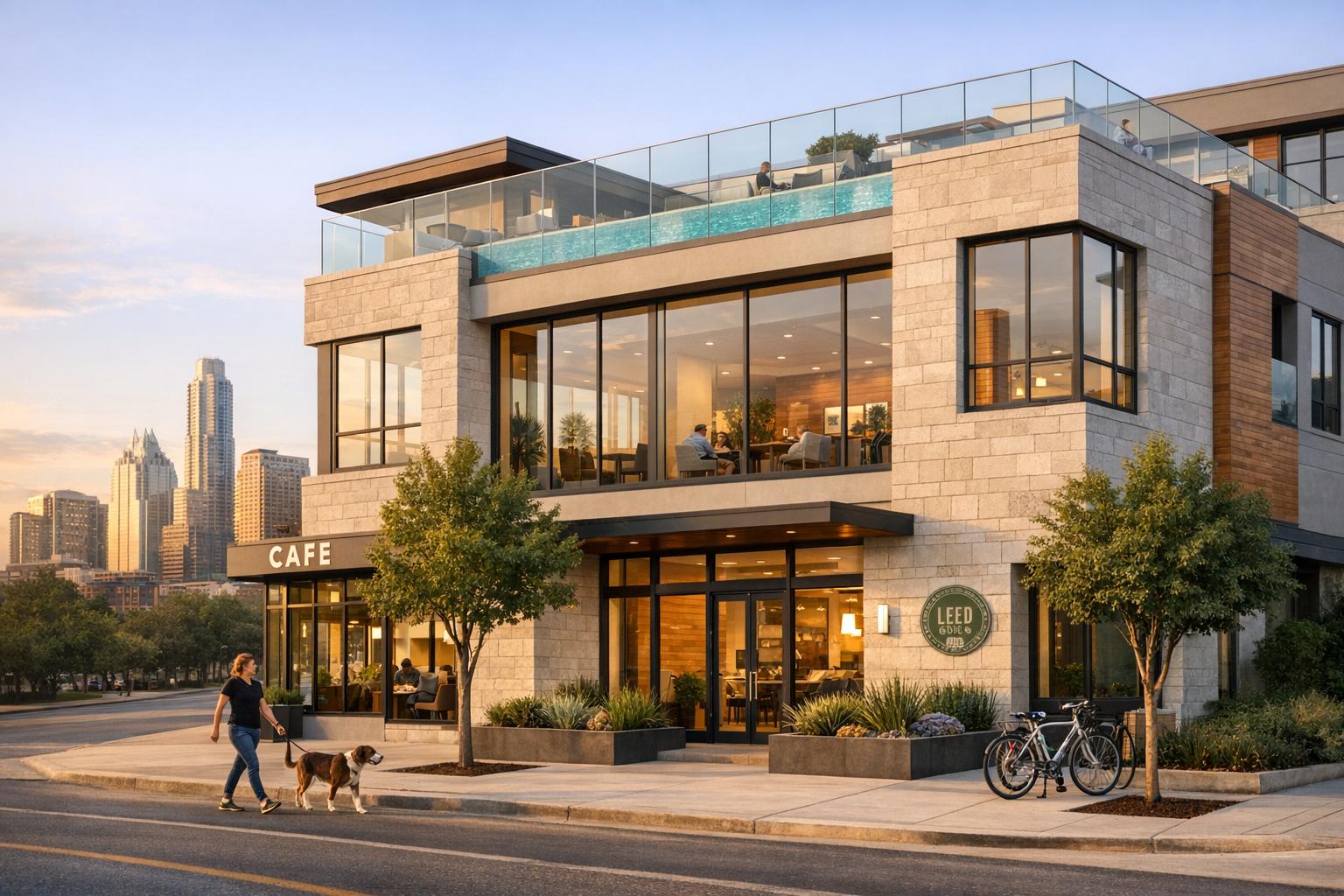 Corazon Apartments, located in East Austin at 1000 E 5th St., offers modern, urban living with a prime location near downtown and the Rainey Street district. With a Walk Score of 96 and a Bike Score of 93, residents enjoy easy access to groceries, restaurants, workplaces, and entertainment – all within walking or biking distance. The property features 256 units, LEED Gold certification, and upscale amenities, including a luxury pool, fitness center, coworking spaces, and a rooftop deck with skyline views.