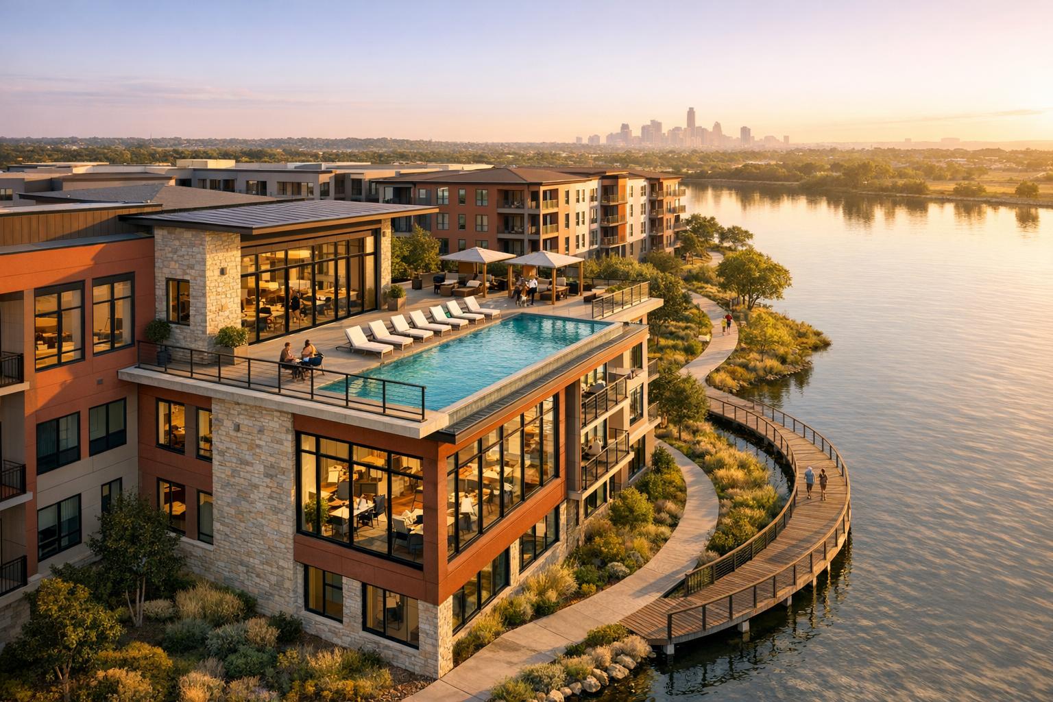 Encore Lakeside Apartments offers 298 modern units in Southeast Austin, blending city convenience with lakeside living. Located at 1120 Town Creek Drive, it’s just 0.1 miles from Lady Bird Lake, the Austin Boardwalk, and major employers like Oracle and the University of Texas. Floor plans range from studios to three bedrooms (576–1,968 sq. ft.), with rents starting at $2,100/month. Amenities include a rooftop pool, fitness center, kayak storage, pet wash station, and coworking spaces. Leasing begins March 20, 2026, with flexible 13–15-month terms. Perfect for professionals seeking vibrant living and outdoor access.