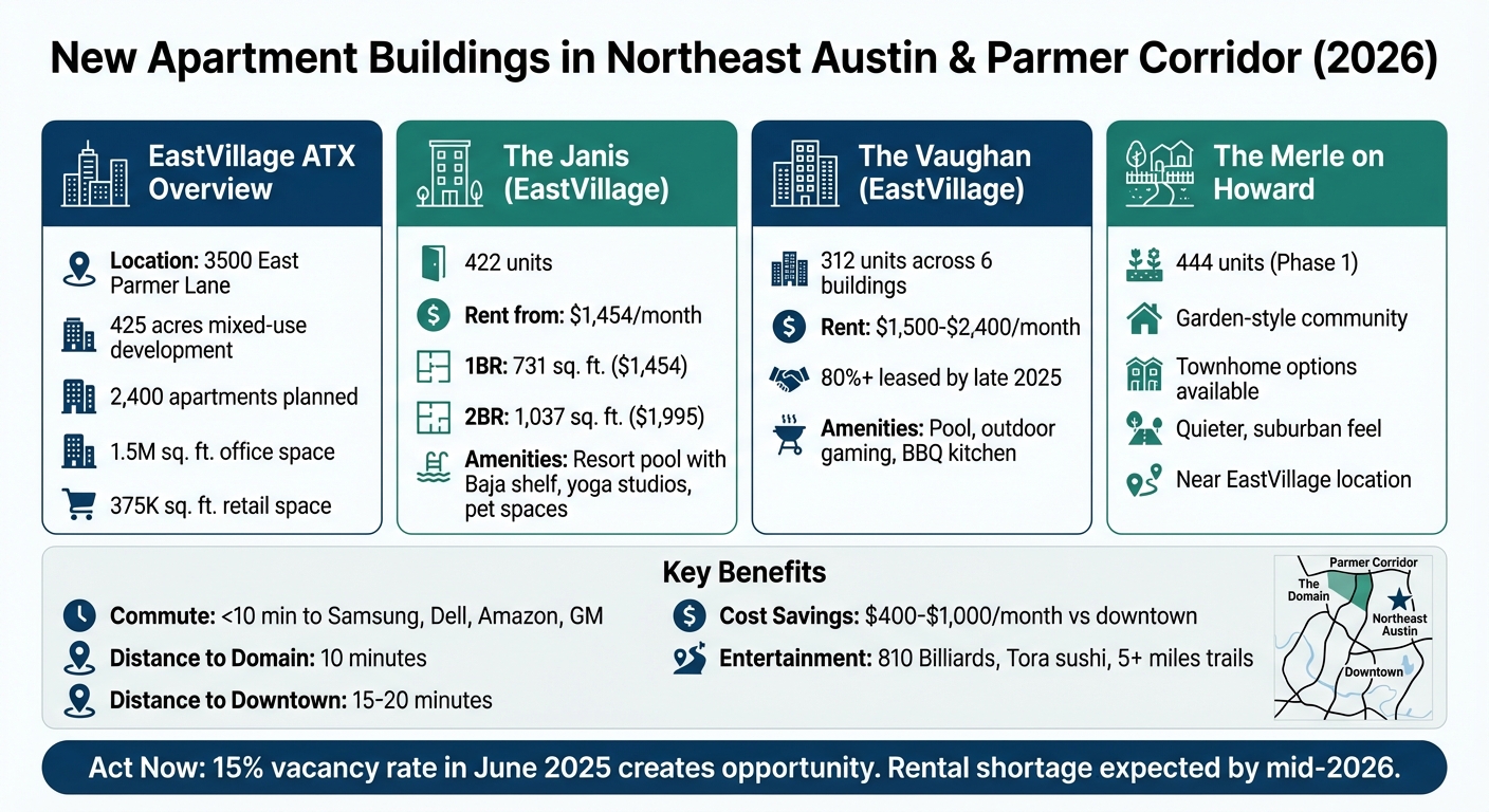 EastVillage ATX, located at 3500 East Parmer Lane, spans 425 acres and sits directly across from the Samsung Austin Semiconductor plant. This development introduces urban living to Northeast Austin , a key part of the broader North Austin area, centered around two major apartment communities: The Janis and The Vaughan.