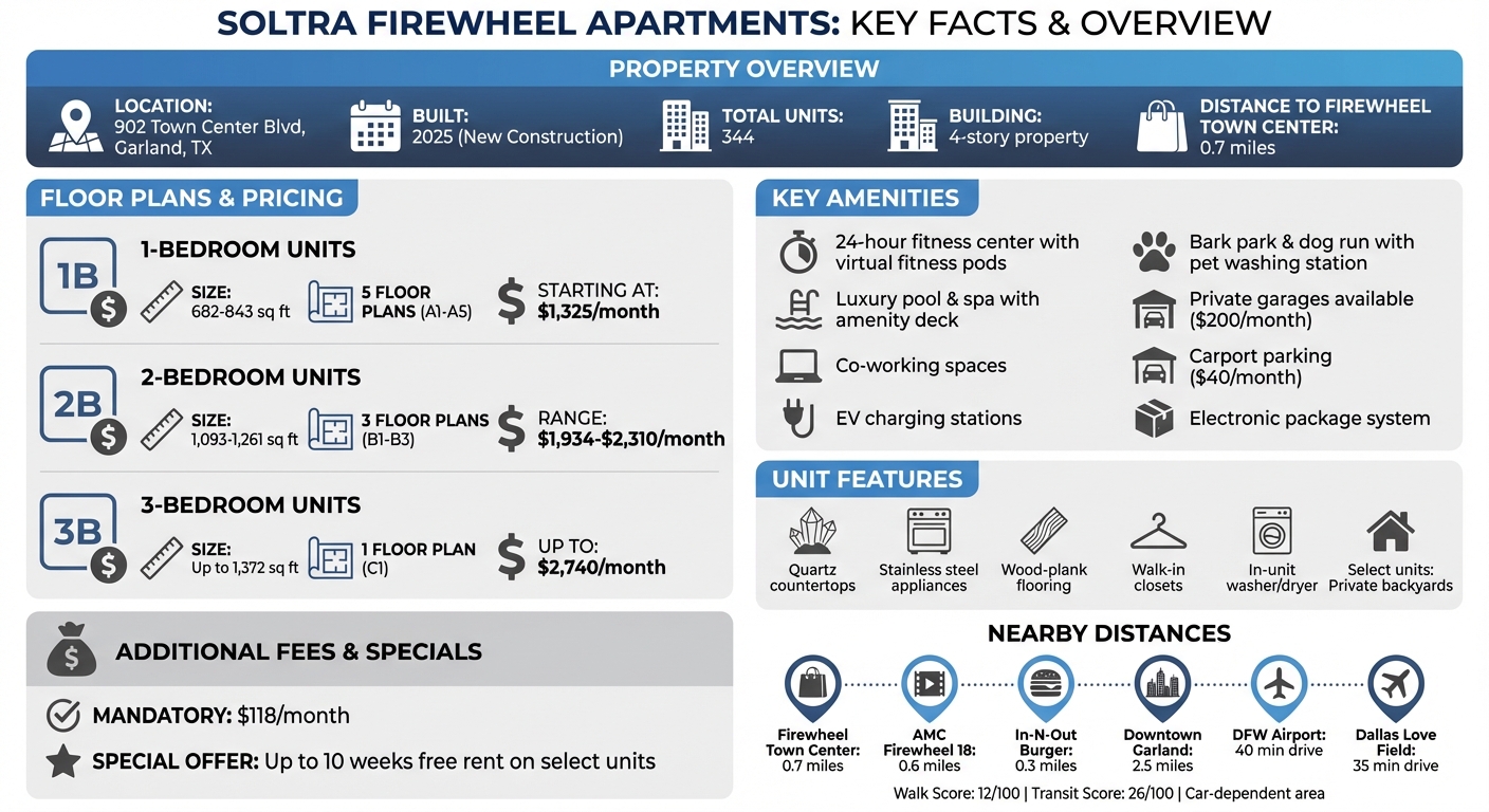 Located at 902 Town Center Blvd in Garland, Texas, Soltra Firewheel Apartments opened in 2025 and offers upscale living close to Firewheel Town Center. With 344 units, this four-story property features modern interiors like quartz countertops, stainless steel appliances, and wood-plank flooring. Designed for professionals and families, it includes amenities such as co-working spaces, a 24-hour fitness center, and spacious floor plans with one to three bedrooms.