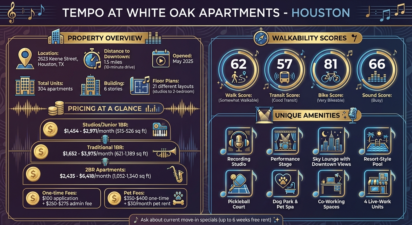 Tempo at White Oak Apartments offers luxury living in Houston’s White Oak District, blending urban convenience with a music-inspired lifestyle. Opened in May 2025, the six-story property features 304 units, ranging from studios to two-bedroom apartments, with rents starting at $1,454. Located 1.5 miles from Downtown Houston, it provides easy access to entertainment, dining, and public transit.